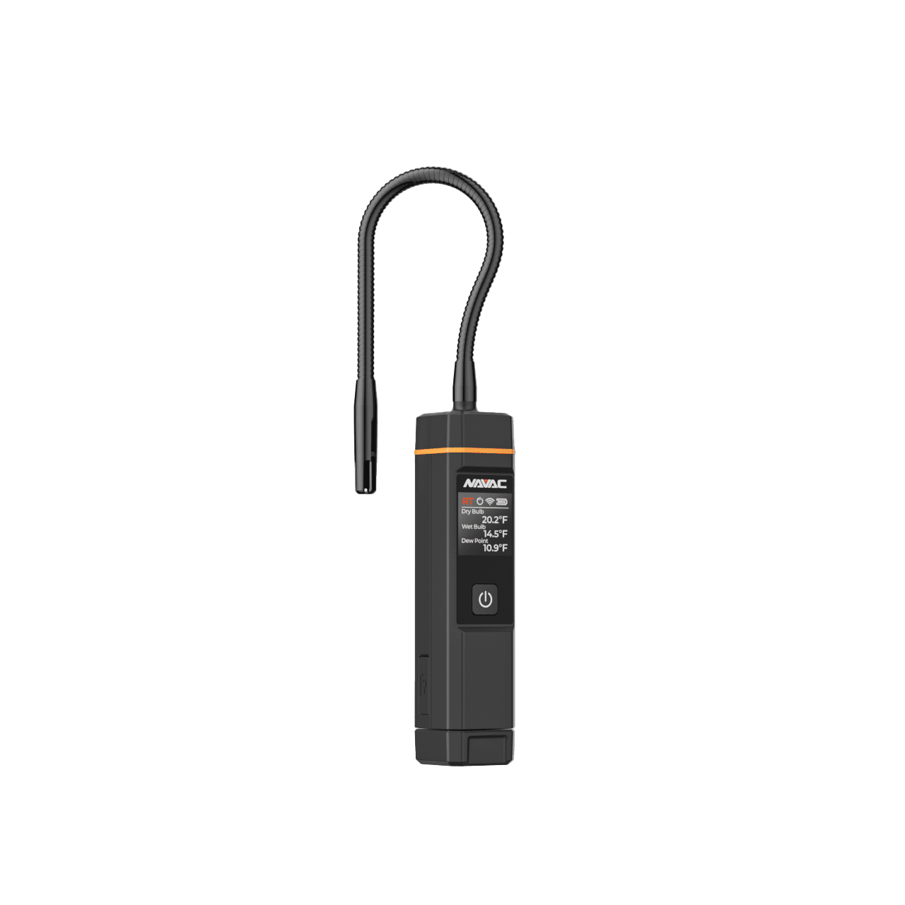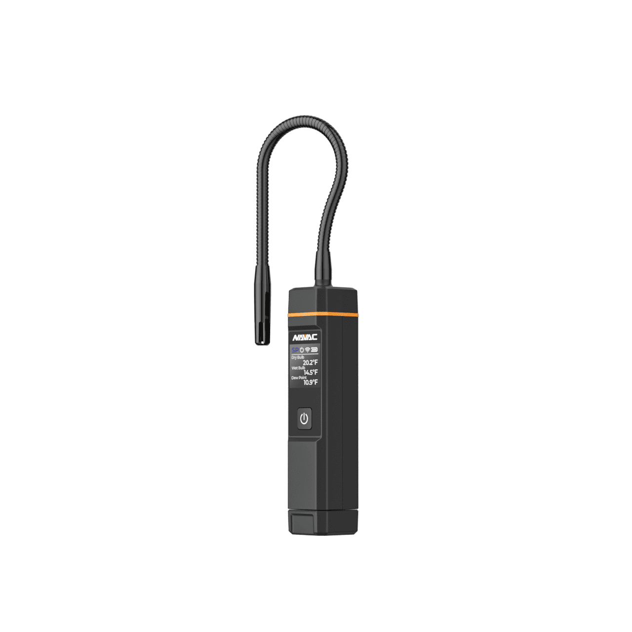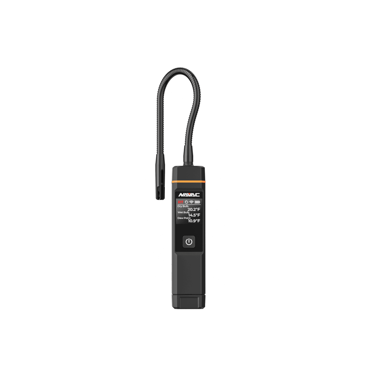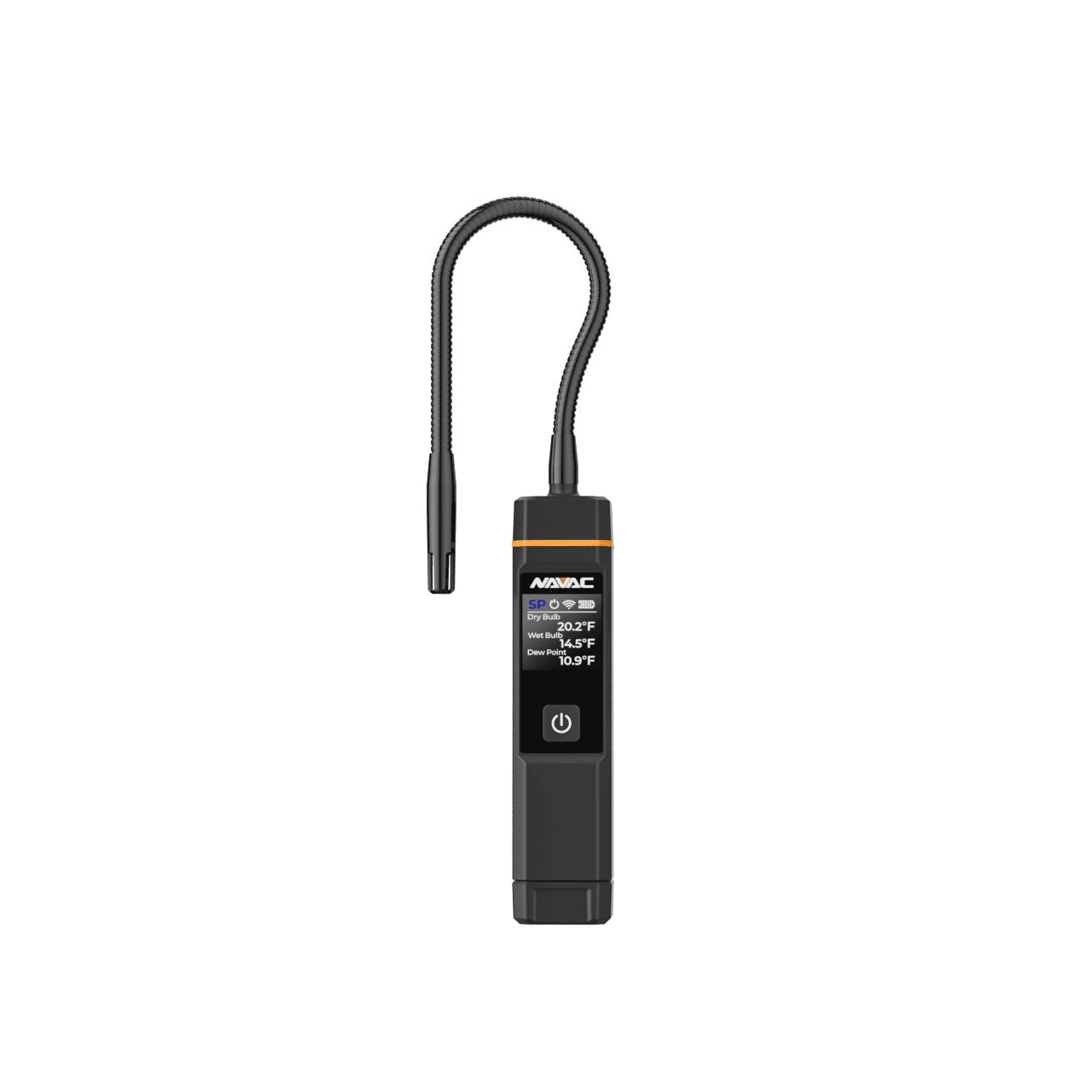The NSH1 Bluetooth Psychrometer offers reliable and precise humidity measurement for HVAC applications. Compatible with the myNAVAC™ app and A2L refrigerants, it provides the flexibility of wireless connectivity or standalone use with a large, easy-to-read digital display. The psychrometer simultaneously displays key psychrometric data points, including dry bulb, wet bulb, dew point, relative humidity, absolute humidity, and enthalpy, ensuring comprehensive insights for diagnostics. Its high-accuracy sensor delivers fast and reliable readings, while the intuitive one-button operation and easy-to-switch knob simplify use. Equipped with a rechargeable lithium battery lasting up to 150 hours and an optional auto power-off feature, the NSH1 combines accuracy, convenience, and durability for a dependable solution.
