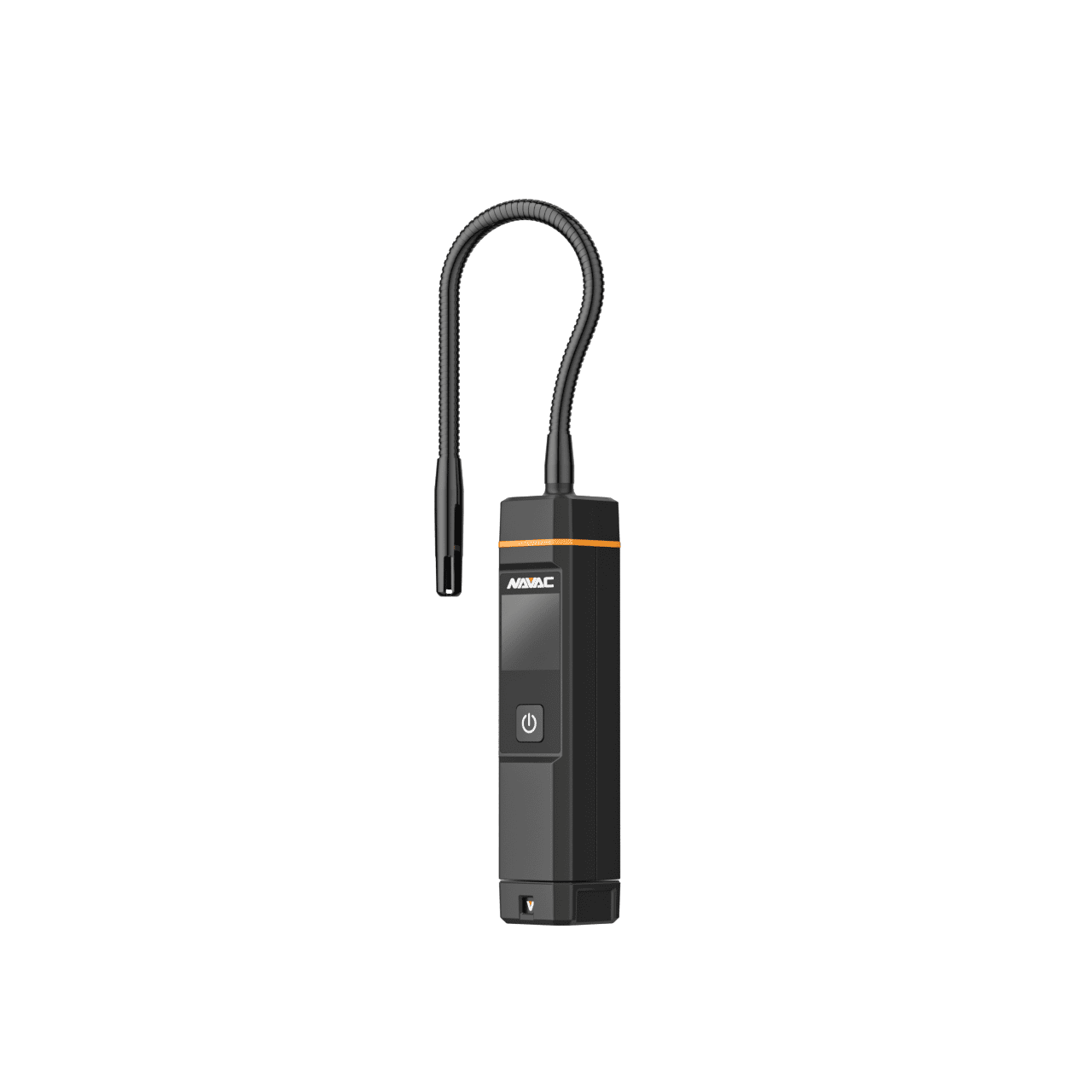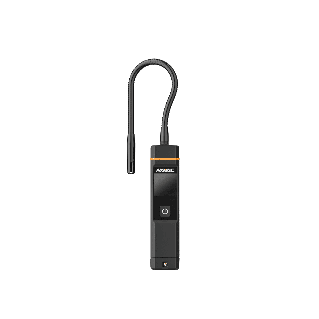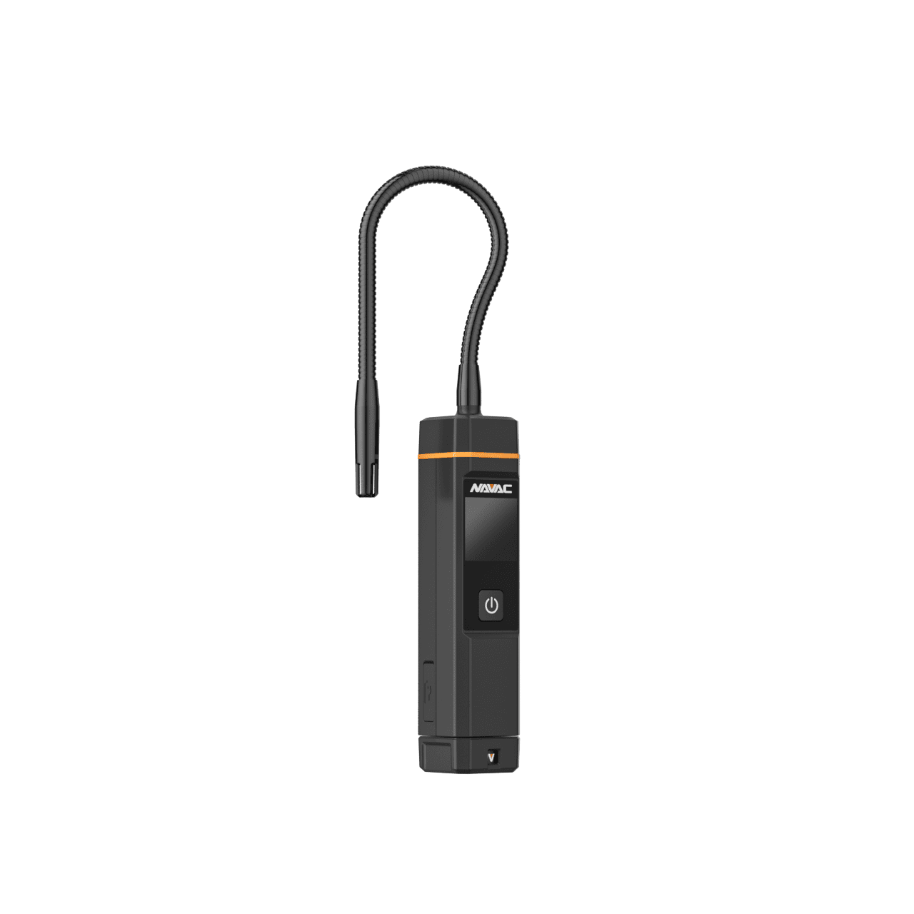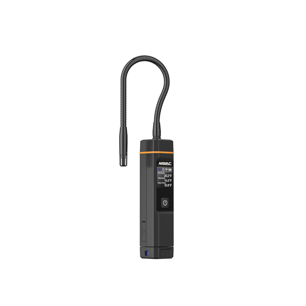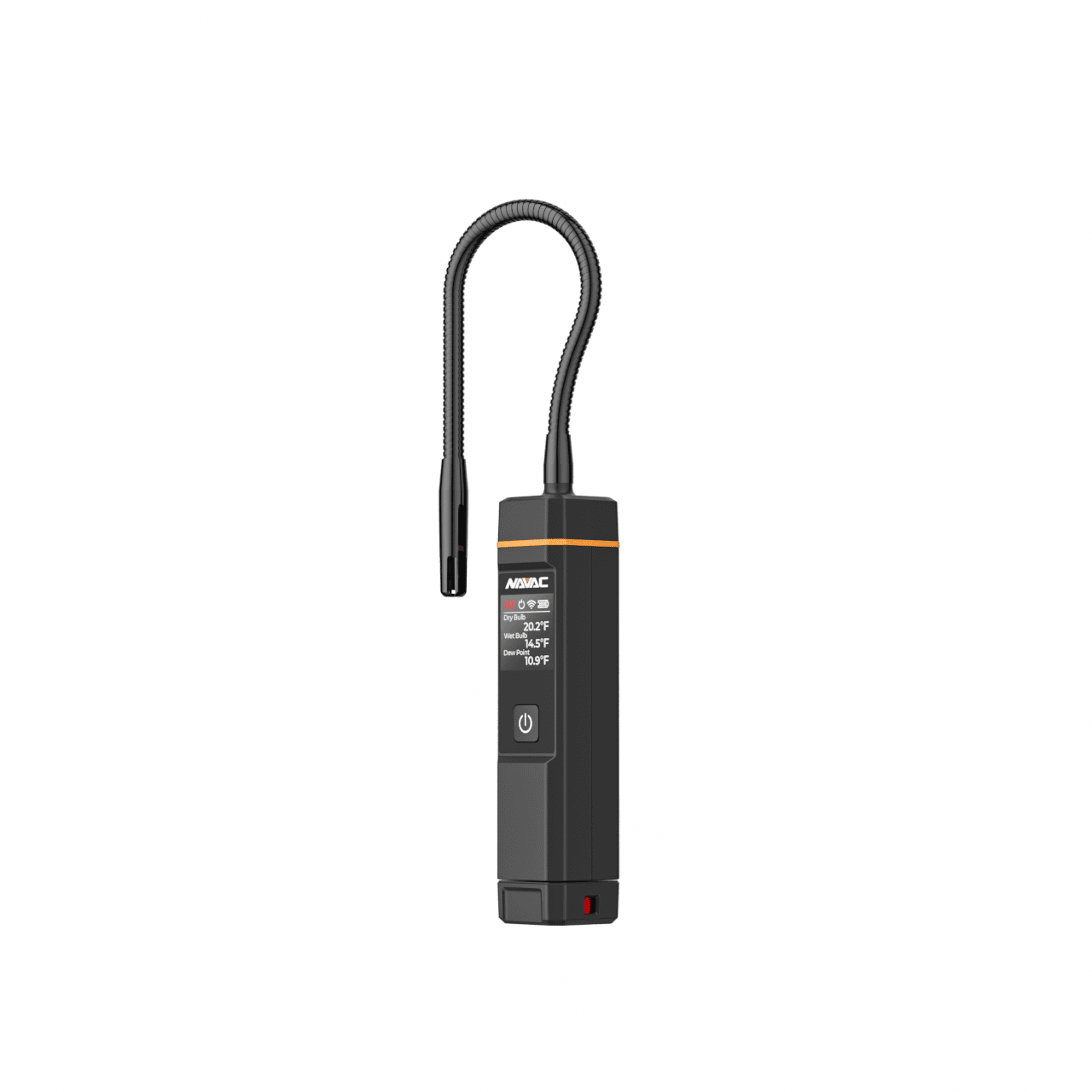 The NSH1 Bluetooth Psychrometer offers reliable and precise humidity measurement for HVAC applications. Compatible with the myNAVAC™ app and A2L refrigerants, it provides the flexibility of wireless connectivity or standalone use with a large, easy-to-read digital display. The psychrometer simultaneously displays key psychrometric data points, including dry bulb, wet bulb, dew point, relative humidity, absolute humidity, and enthalpy, ensuring comprehensive insights for diagnostics. Its high-accuracy sensor delivers fast and reliable readings, while the intuitive one-button operation and easy-to-switch knob simplify use. Equipped with a rechargeable lithium battery lasting up to 150 hours and an optional auto power-off feature, the NSH1 combines accuracy, convenience, and durability for a dependable solution.