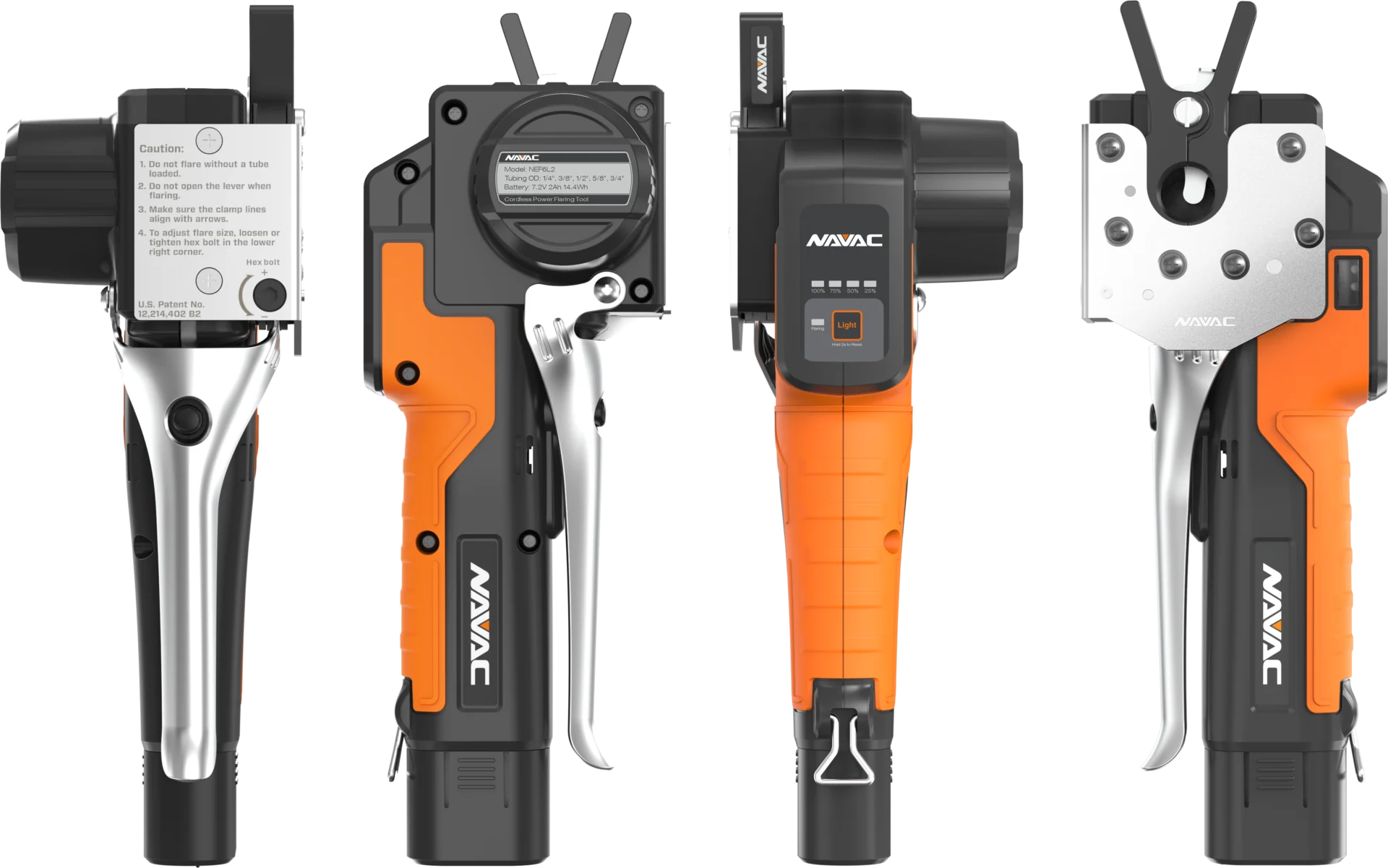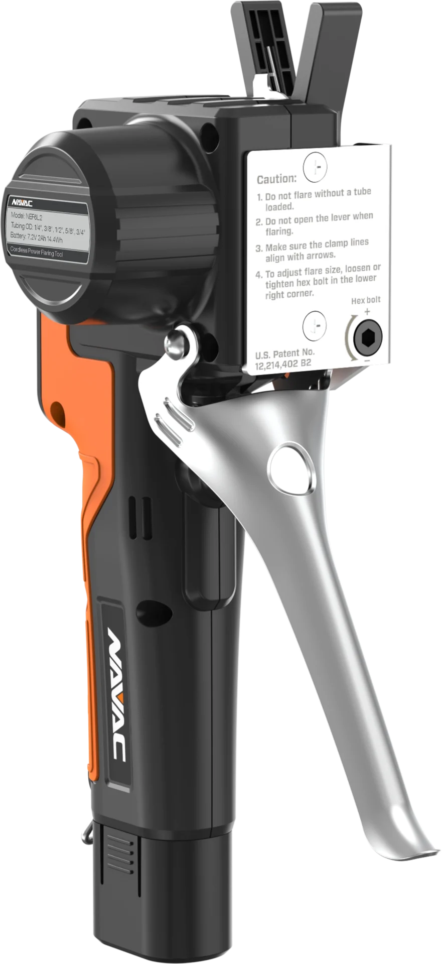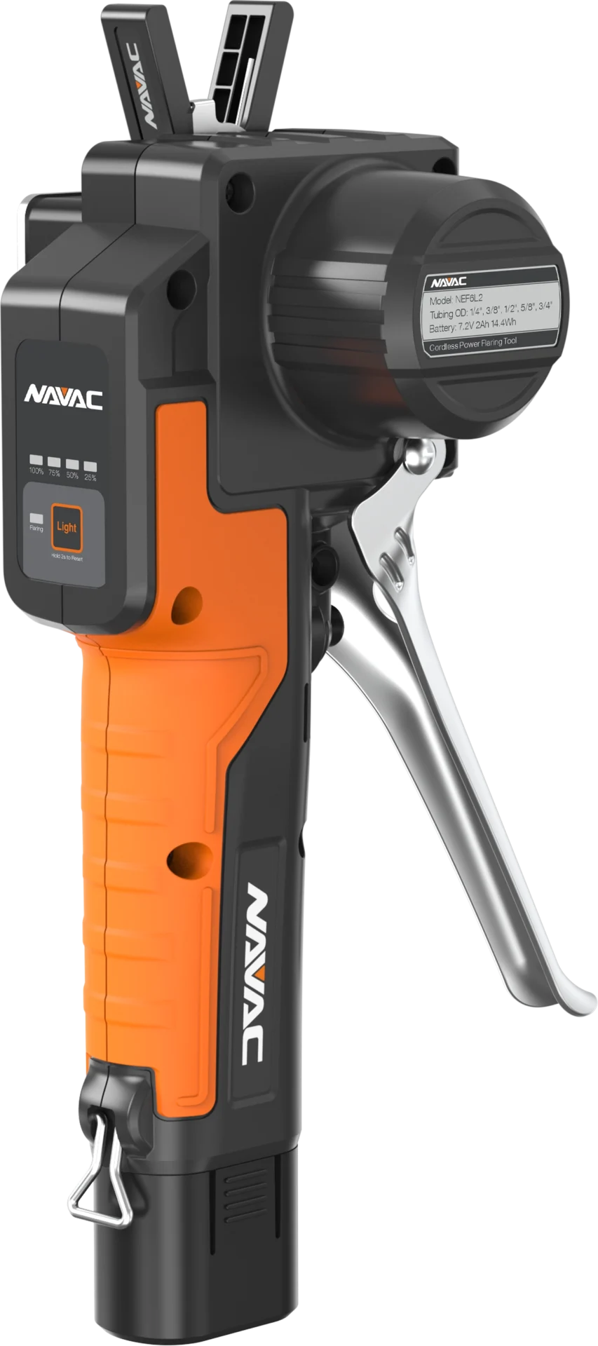 A game-changing alternative to manual flaring, the NEF6L2 BreakFree® Power Flare delivers fast, accurate, and hassle-free flares in a fraction of the time required by traditional methods. Weighing under 3 pounds, this lightweight automatic flaring tool features true one-button, one-hand operation and is engineered for reliable performance in harsh jobsite conditions. The NEF6L2 is powered by the new NBF3 Type-C rechargeable battery, capable of producing over 100 consistent flares per charge with faster, more convenient charging. Upgraded durable, lightweight tube clamps enhance strength and long-term reliability, while a built-in battery indicator and integrated flashlight improve usability in tight or low-light spaces. The NEF6L2 comes in a compact blow-molded case and includes five commonly used flare dies up to 3/4″, along with the NBF3 battery, providing a complete, professional flaring solution right out of the box.