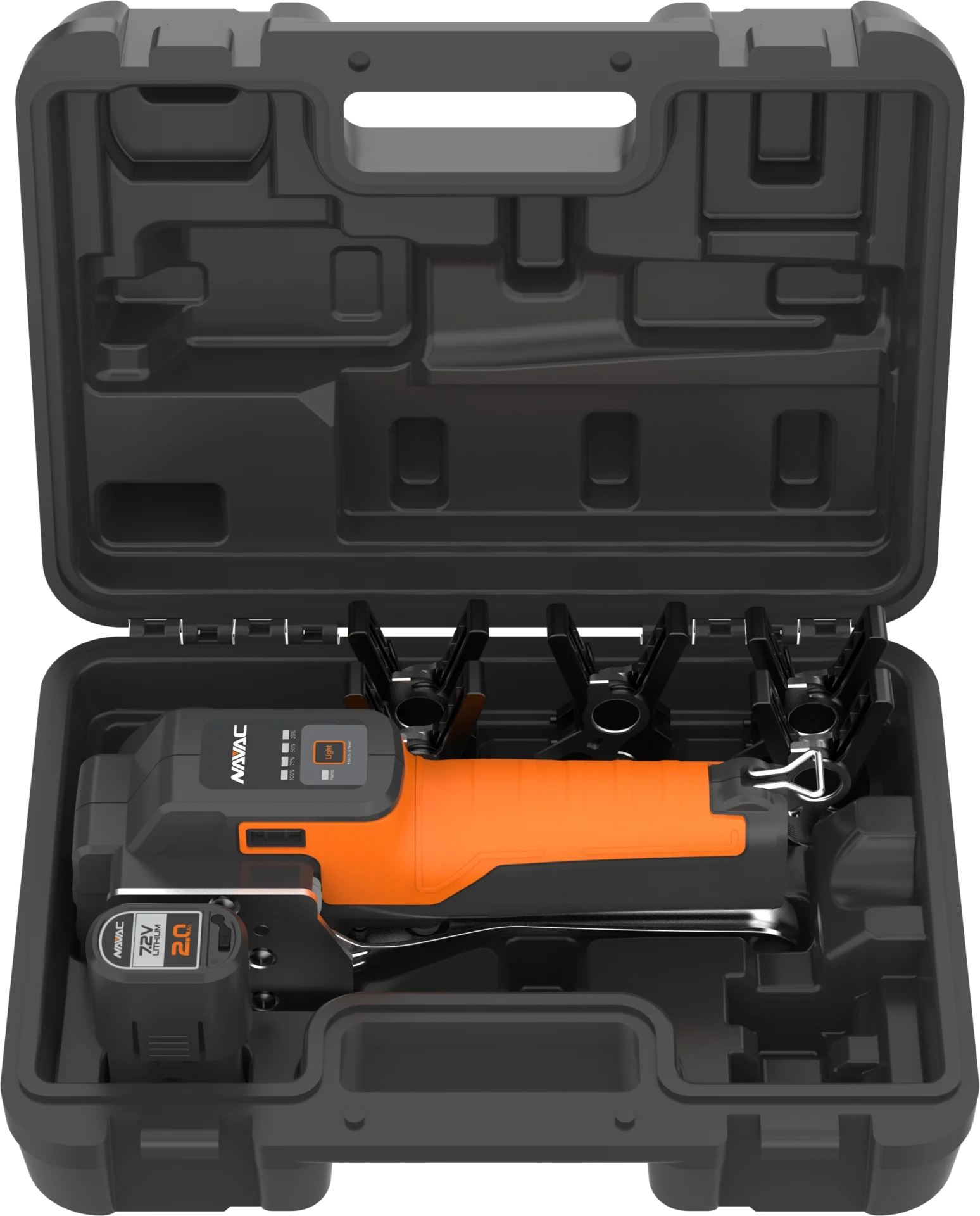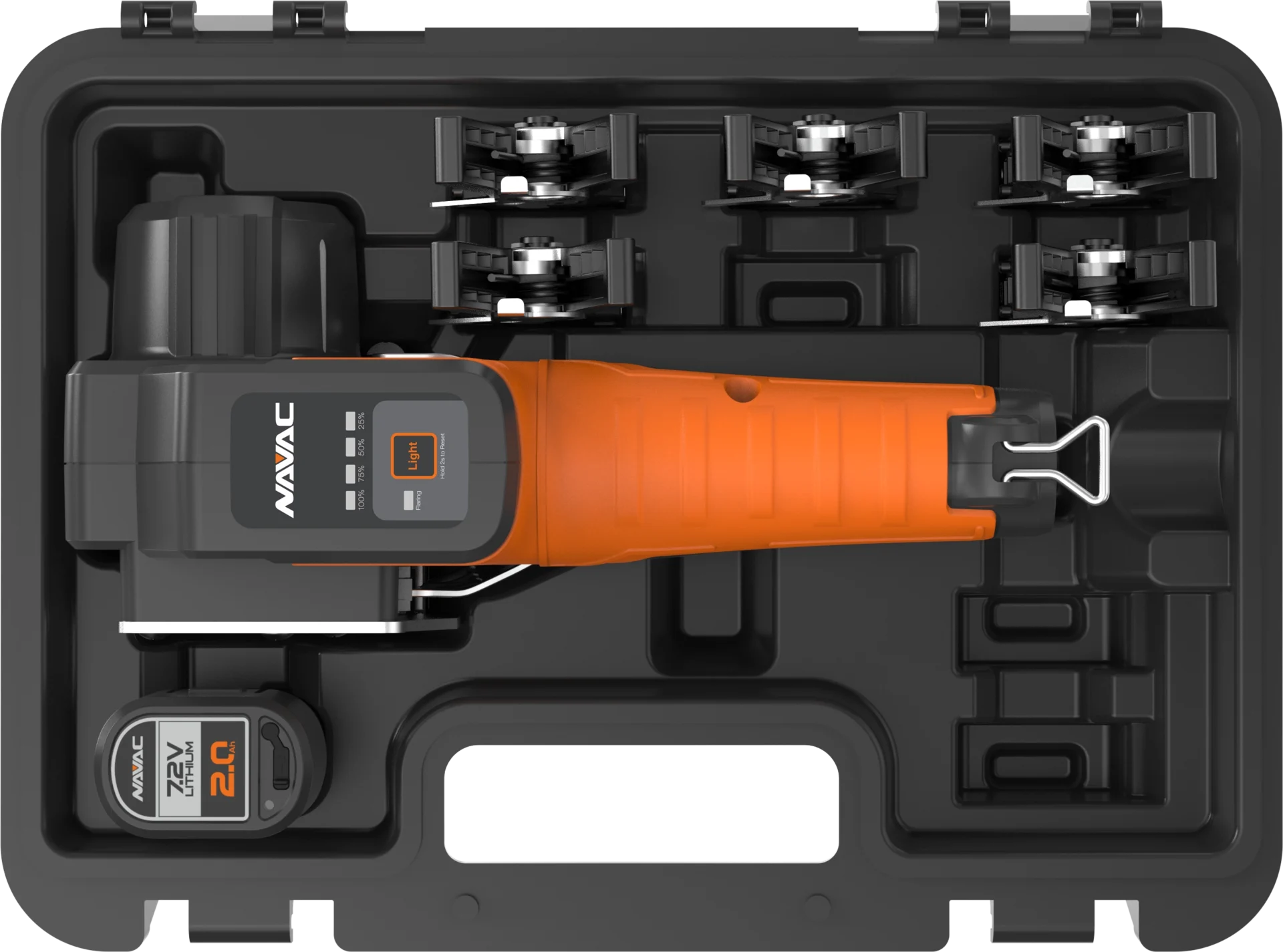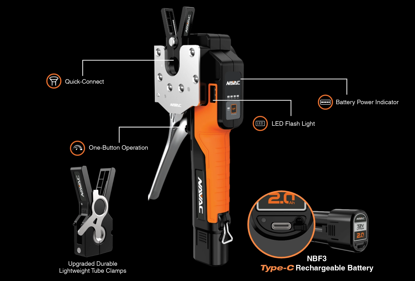 A game-changing alternative to manual flaring, the NEF6L2 BreakFree® Power Flare delivers fast, accurate, and hassle-free flares in a fraction of the time required by traditional methods. Weighing under 3 pounds, this lightweight automatic flaring tool features true one-button, one-hand operation and is engineered for reliable performance in harsh jobsite conditions. The NEF6L2 is powered by the new NBF3 Type-C rechargeable battery, capable of producing over 100 consistent flares per charge with faster, more convenient charging. Upgraded durable, lightweight tube clamps enhance strength and long-term reliability, while a built-in battery indicator and integrated flashlight improve usability in tight or low-light spaces. The NEF6L2 comes in a compact blow-molded case and includes five commonly used flare dies up to 3/4″, along with the NBF3 battery, providing a complete, professional flaring solution right out of the box.