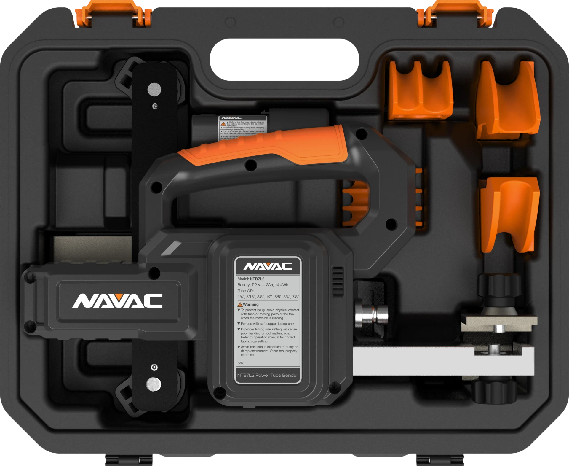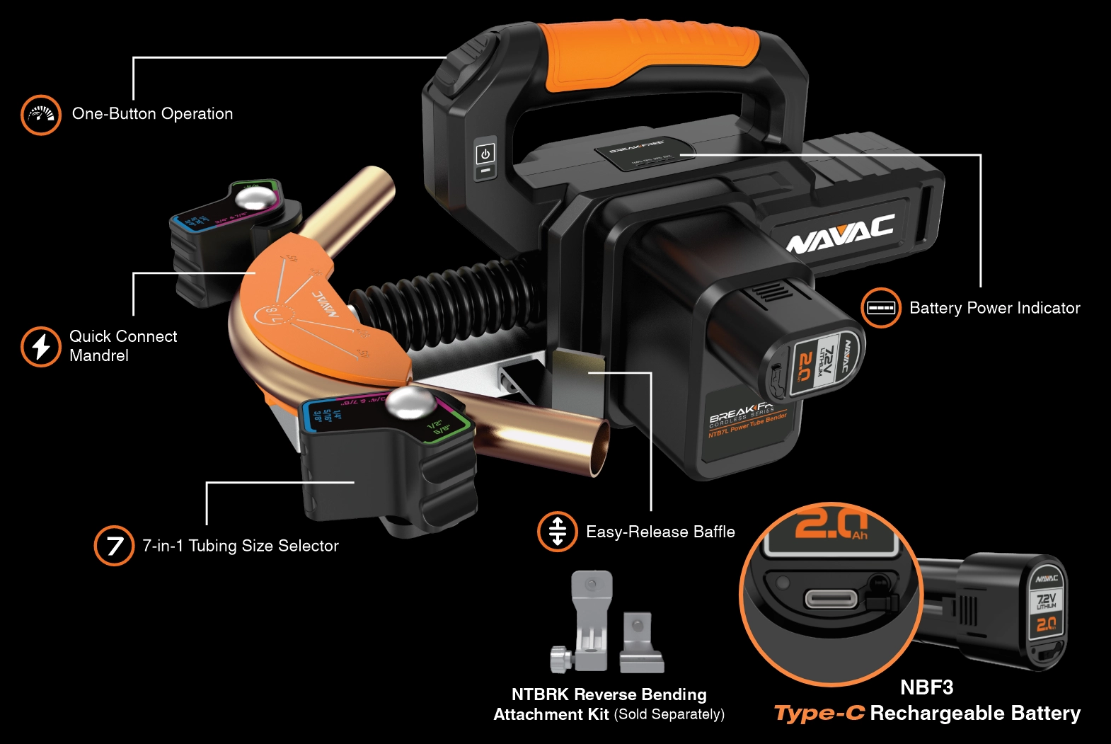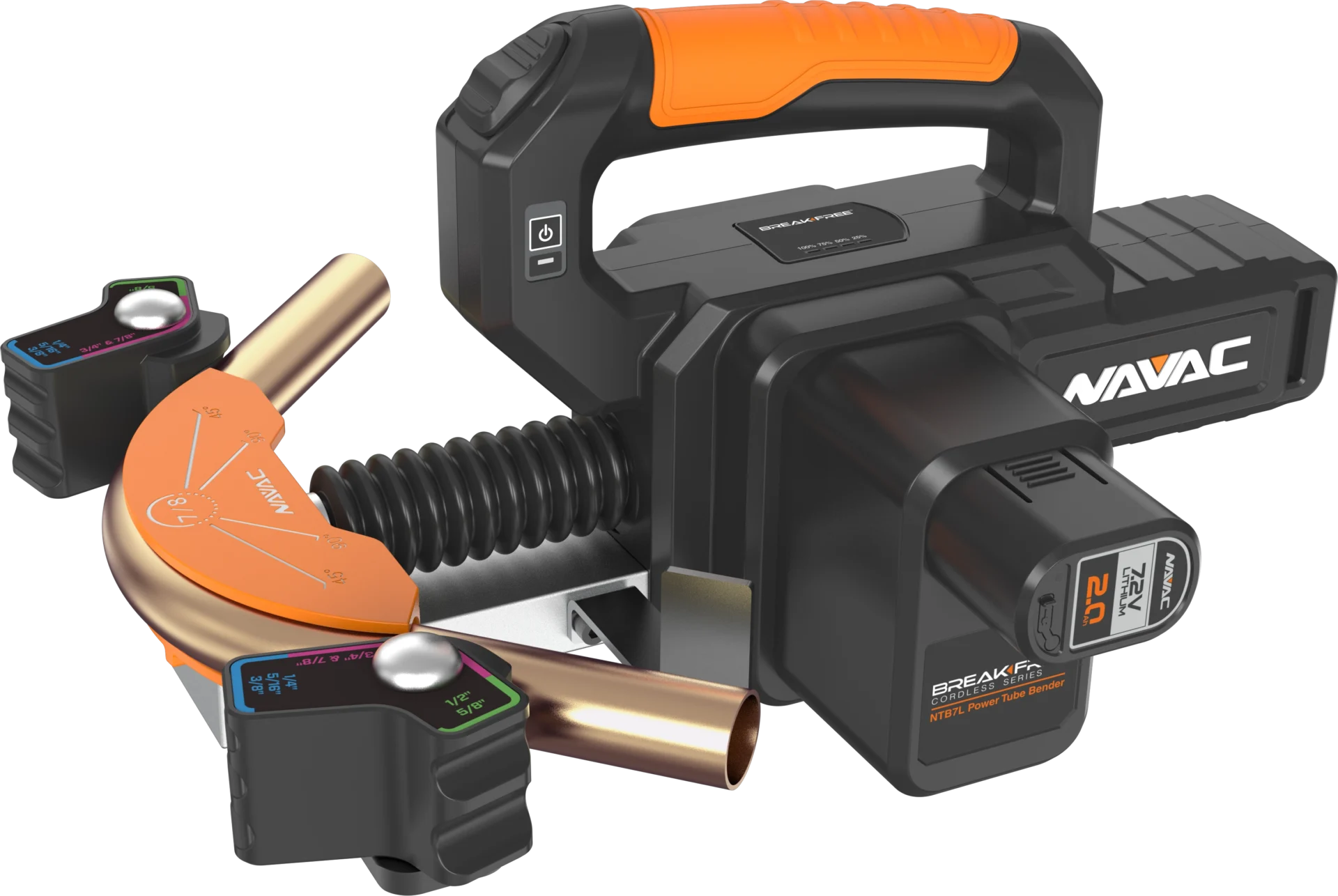 Bending large-diameter tubing can be a labor-intensive and frustrating task for HVAC technicians, often requiring precision and extra effort to remove tubing from traditional benders. The NAVAC NTB7L2 Power Tube Bender is designed to make the job faster and easier. Suitable for tubing sizes from 1/4″ to 7/8″ OD, this battery-driven bender allows technicians to push and hold the control switch to bend tubing smoothly up to 90°, stopping at any point for customized angles. The tool automatically releases the tubing as it resets, eliminating the need for manual removal. Powered by the new NBF3 Type-C rechargeable lithium battery, the NTB7L2 delivers over 100 bends per charge with fast 45-minute Type-C charging, while a battery power indicator keeps users informed. Its upgraded, patented 7-size-in-1 crossbar simplifies workflow across different tubing sizes. An ergonomic handle, quick-connect mandrels, and a NTBRK reverse bending kit (sold separately) further enhance ease of use, making the NTB7L2 a powerful, time-saving solution for modern HVAC professionals.