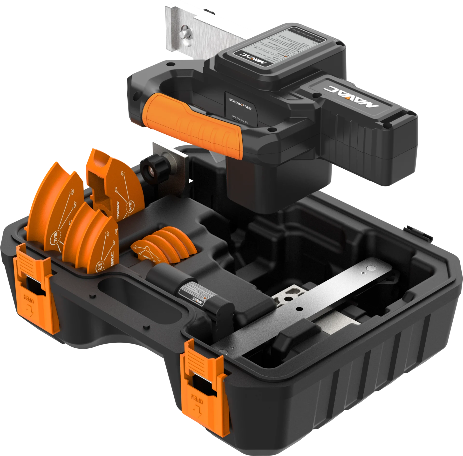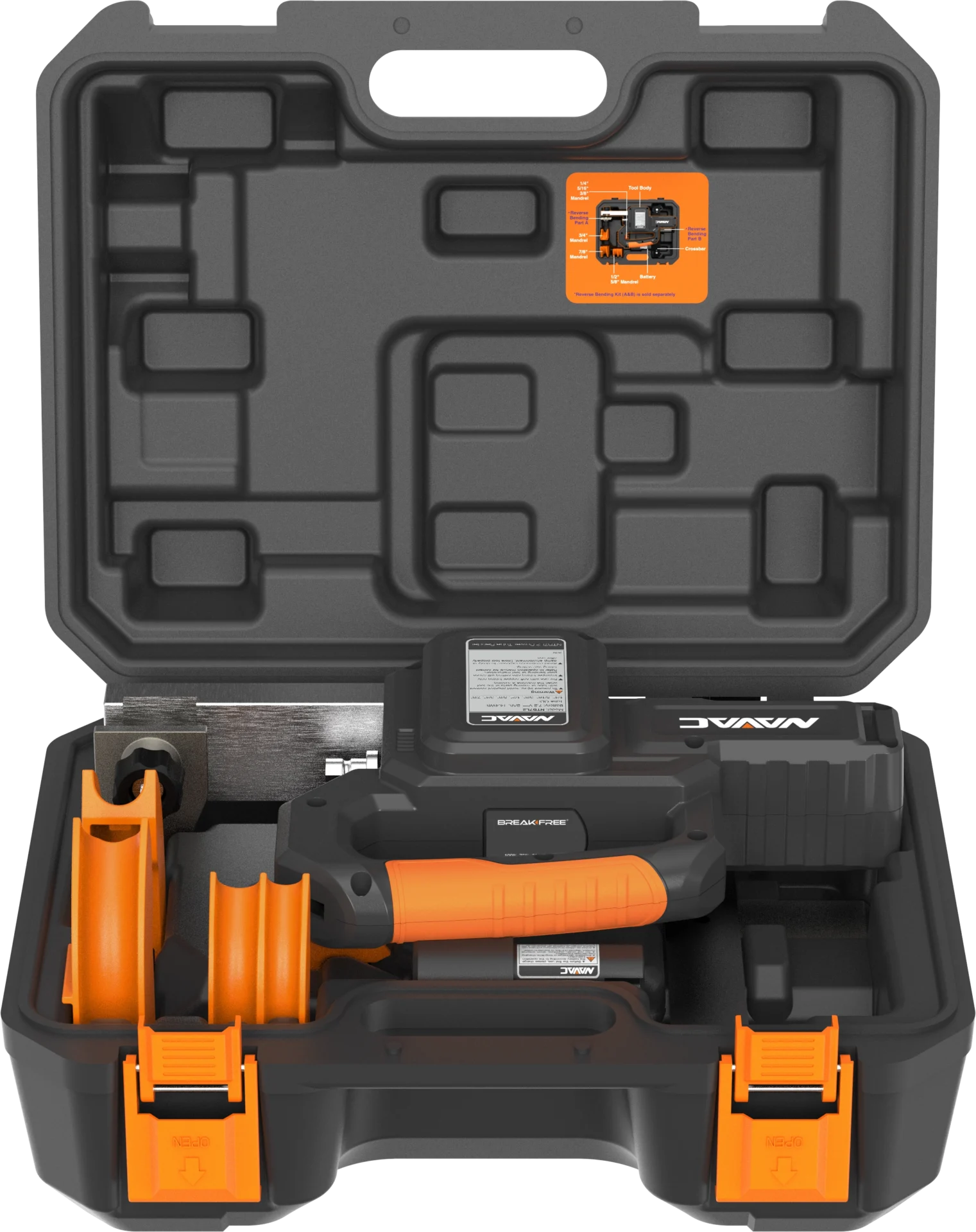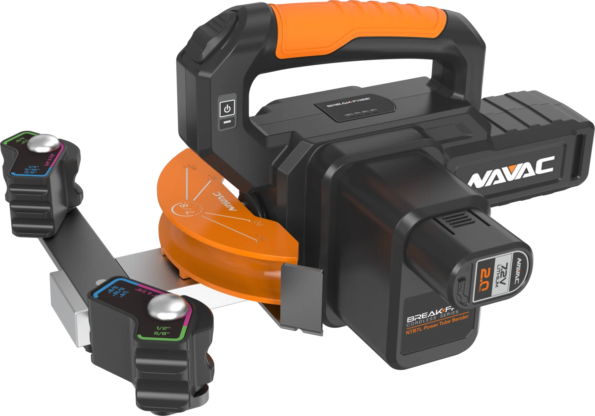 Bending large-diameter tubing can be a labor-intensive and frustrating task for HVAC technicians, often requiring precision and extra effort to remove tubing from traditional benders. The NAVAC NTB7L2 Power Tube Bender is designed to make the job faster and easier. Suitable for tubing sizes from 1/4″ to 7/8″ OD, this battery-driven bender allows technicians to push and hold the control switch to bend tubing smoothly up to 90°, stopping at any point for customized angles. The tool automatically releases the tubing as it resets, eliminating the need for manual removal. Powered by the new NBF3 Type-C rechargeable lithium battery, the NTB7L2 delivers over 100 bends per charge with fast 45-minute Type-C charging, while a battery power indicator keeps users informed. Its upgraded, patented 7-size-in-1 crossbar simplifies workflow across different tubing sizes. An ergonomic handle, quick-connect mandrels, and a NTBRK reverse bending kit (sold separately) further enhance ease of use, making the NTB7L2 a powerful, time-saving solution for modern HVAC professionals.