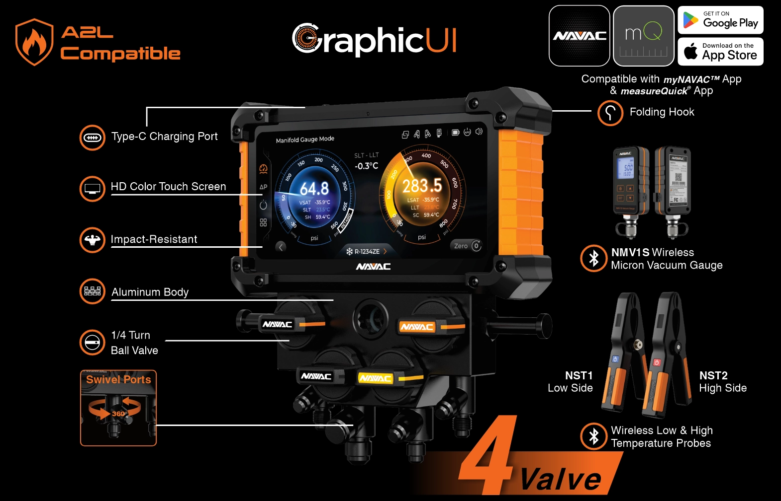 Whether working with legacy refrigerants like R22 or modern blends such as R454B, NEXUS 2 supports 100 refrigerants and stays future-ready with easy updates via the myNAVAC App. Engineered for toughness, it features a heavy-duty protective shell that safeguards both the sensors and the HD touchscreen, ensuring long-lasting durability. With Class 0.4 accuracy, smart wireless connectivity, rechargeable battery power, and seamless integration with MeasureQuick App, NEXUS 2 expands its usability. For added convenience and control, NEXUS 2 includes quarter-turn ball valves for faster operation and swivel hose ports to increase portability and flexibility in tight spaces.