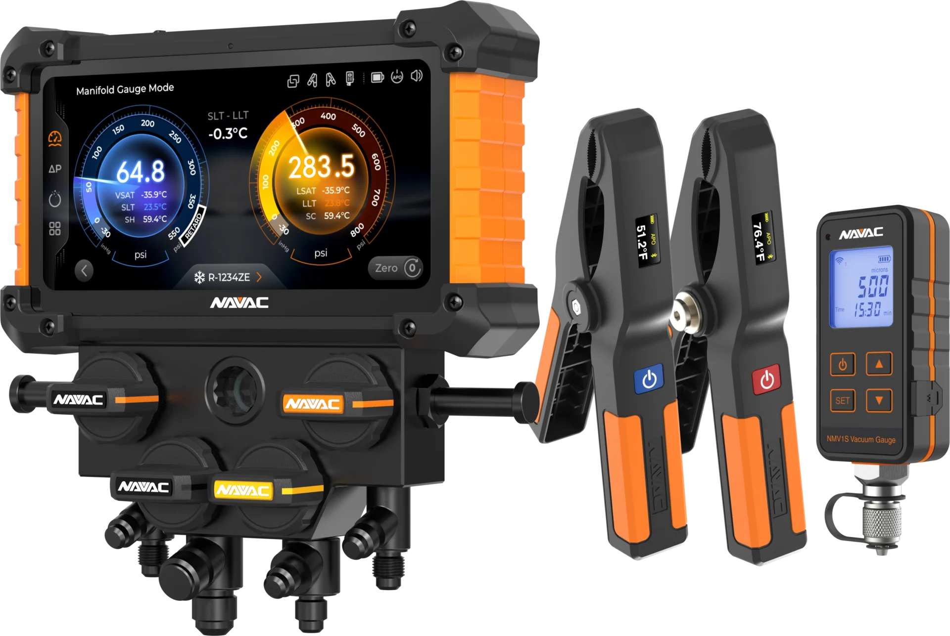 | Accessory | Bluetooth Temperature Clamps NST1 (Low Side) & NST2 (High Side), Charging Cable, Storage Bag | NMV1S Vacuum Gauge in addition to the NX4G Kit |