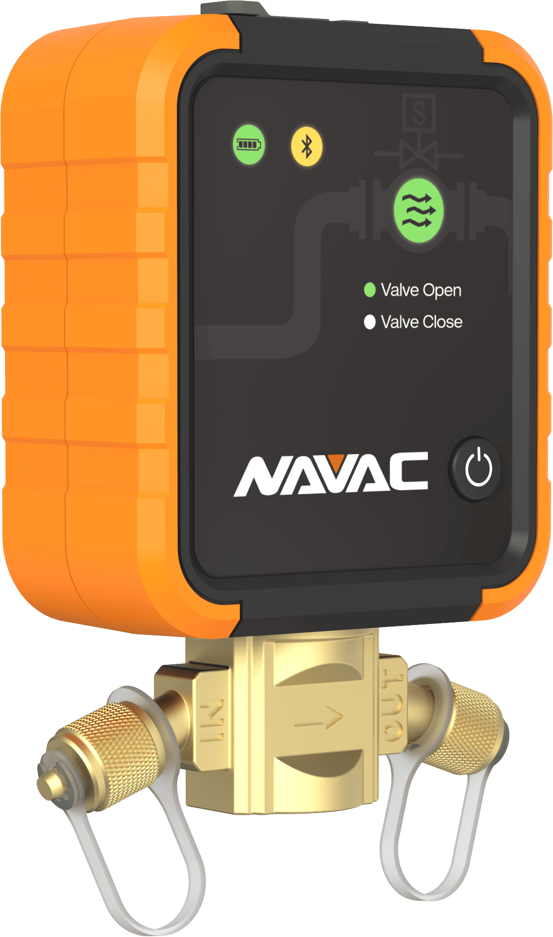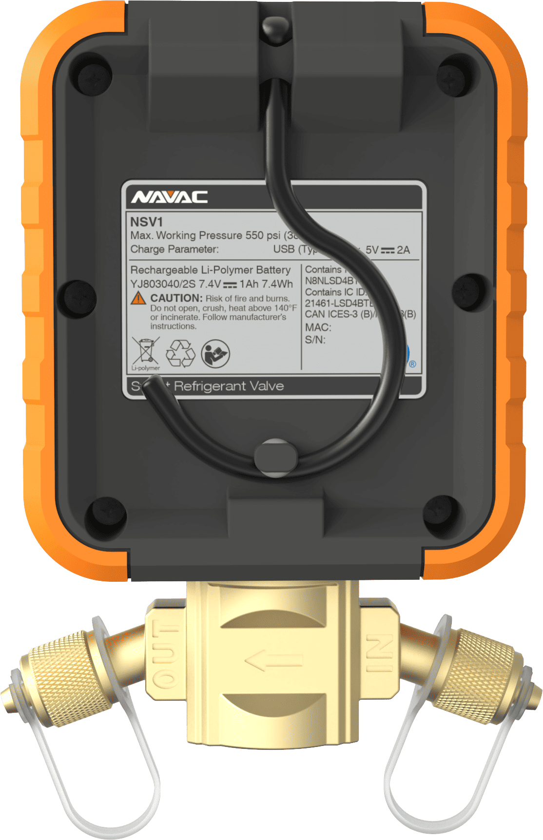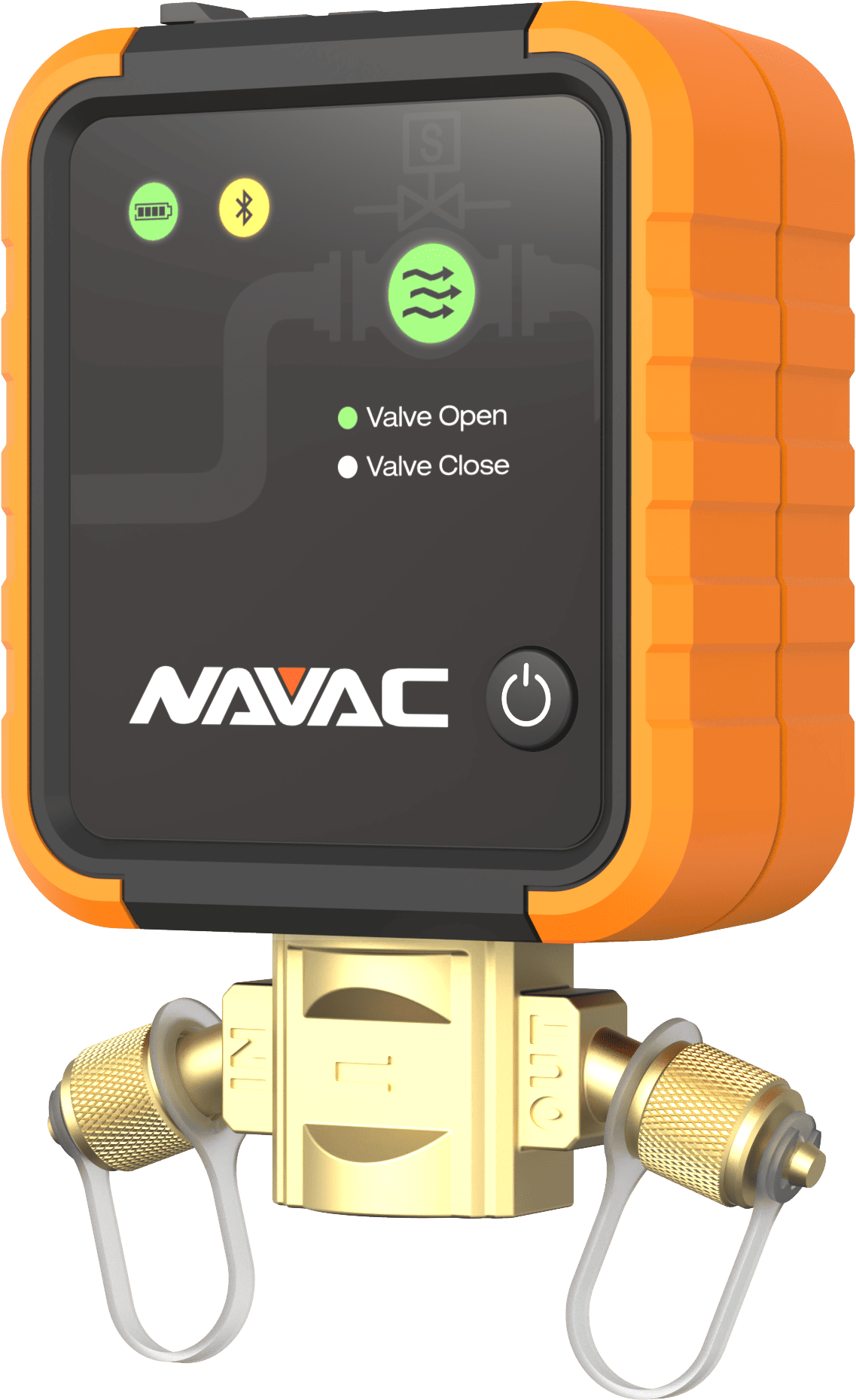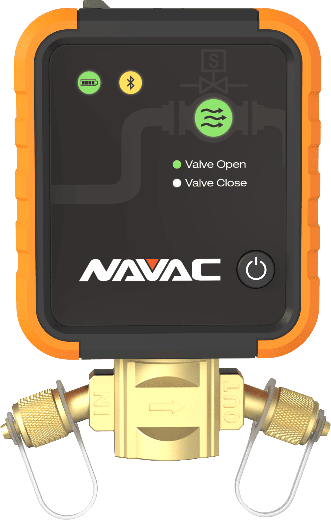 The NSV1 Smart Refrigerant Valve offers advanced control and precision for refrigerant charging and recovery tasks. Fully compatible with the myNAVAC™ App and A2L refrigerants, it enables wireless connectivity with the NRS2A refrigerant scale for seamless operation. Equipped with a smart solenoid valve, the NSV1 provides automatic refrigerant flow control with real-time status indicators for flow, Bluetooth connection, and power. Its rechargeable lithium battery delivers up to 60 hours of runtime, with a battery indicator for added convenience. Built with an impact-resistant, IP54-rated design and a compact form factor featuring a folding hook, the NSV1 combines durability and portability for efficient, reliable performance in HVAC applications.