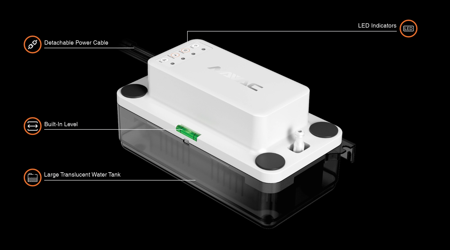 The NCT145 Tank Pump provides smart, automatic condensate management with reliable performance and easy maintenance for HVAC systems. Powered by a durable centrifugal pump and brushless DC motor, it delivers a maximum lift of 23 feet and handles condensate temperatures up to 160°F. A built-in water-level safety sensor with overflow protection ensures safe operation, while the 1/2-gallon translucent tank allows quick inspection and improved efficiency. Featuring automatic self-cleaning, a manual drain, LED status indicators, and a 3/8″ OD discharge port with a built-in check valve, the NCT145 is a homeowner’s ideal condensate management solution for ducted systems, while remaining easy for technicians to install, service, and maintain.